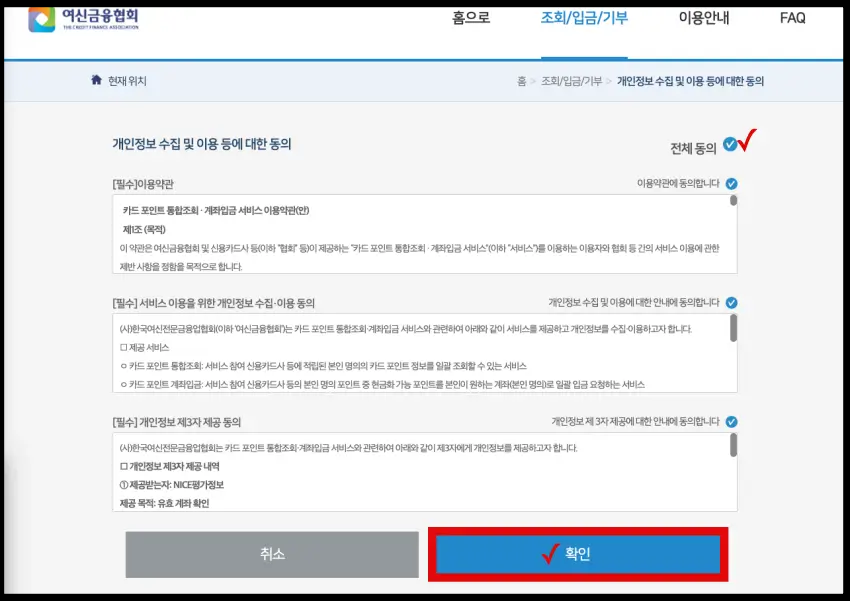 화면이 전환되고 개인정보 수집 및 이용 등에 대한 동의가 뜨게 되는데요 바로 전체 동의 클릭해서 확인 버튼 눌러주면 됩니다.